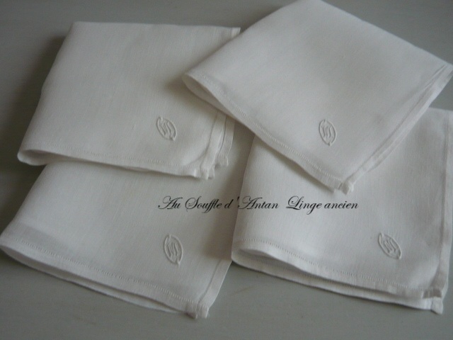 4 mouchoirs lin brodés de la lettre M linge ancien blanc 29 x 29 cm