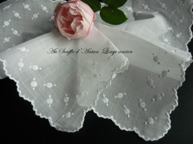 • Linge ancien blanc brodé mouchoir ancien Souffle d'Antan Semis de petites fleurs brodées main sur mouchoir en linon de lin satiné   Prix : 20.00 euros Réf. : 8686   Article disponible (En stock) En savoir plus