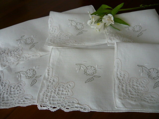 6 charmantes serviettes broderie et dentelle fait main Linge ancien 42 x 41 cm
