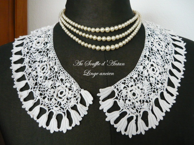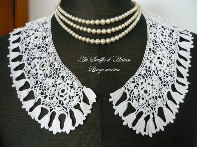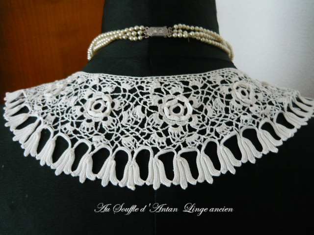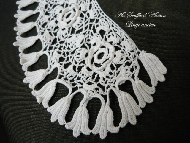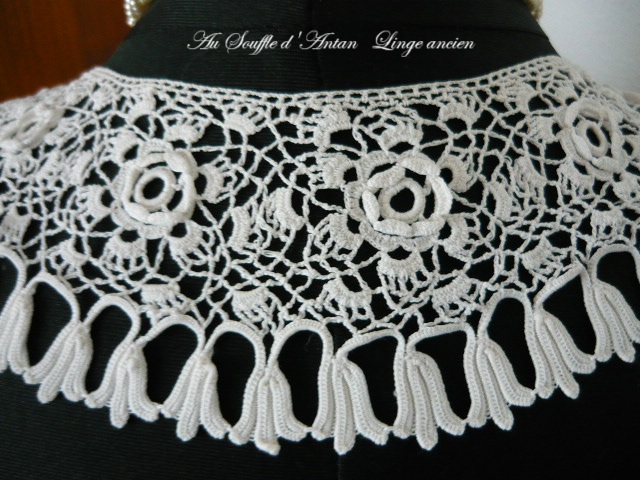 Gracieux col ancien au point d'Irlande (appelé aussi crochet breton) à motifs de fleurs dont des roses en volume. Il est d'une belle dimension