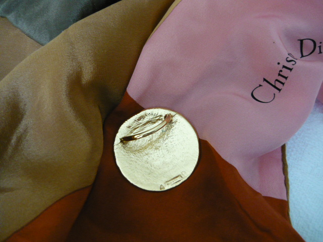 Serre foulard en métal doré de forme ronde Ø 4.5cm inscription gravée sur la face avant YVES SAINT LAURENT, à l'arrière Made in France
