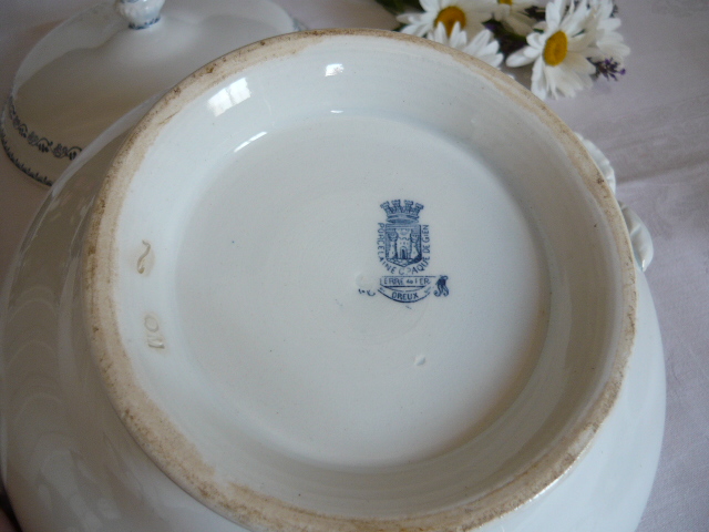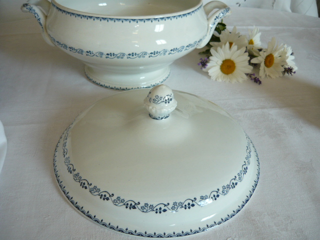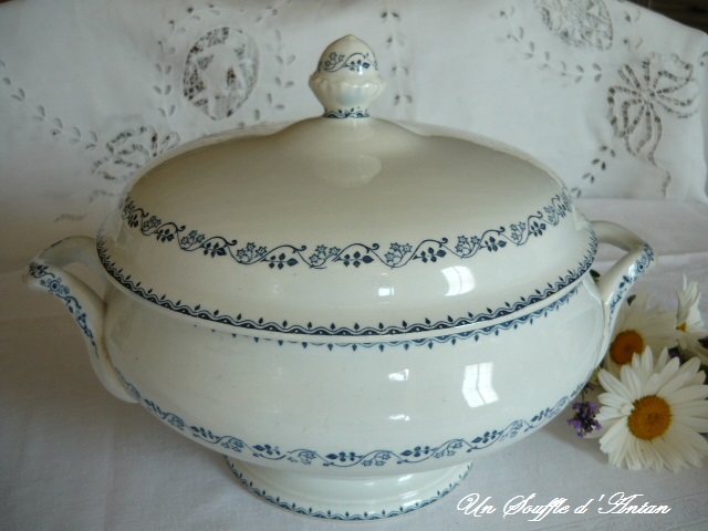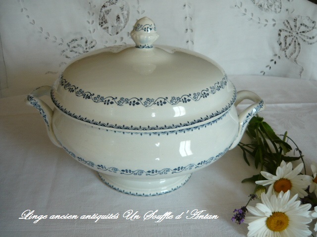 linge ancien antiquité avec sa petite brocante de charme superbe soupière ancienne soupière de gien modèle Dreux