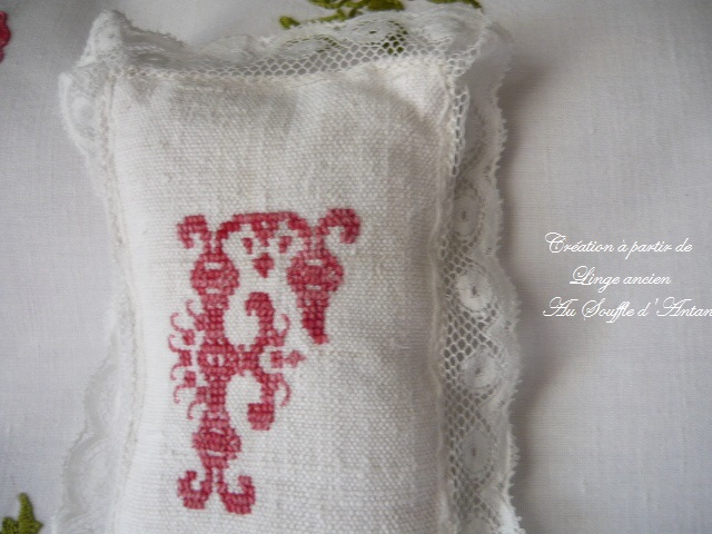 Linge ancien -/création à partir de linge ancien / shabby chic // coussin aux fleurs de lavande