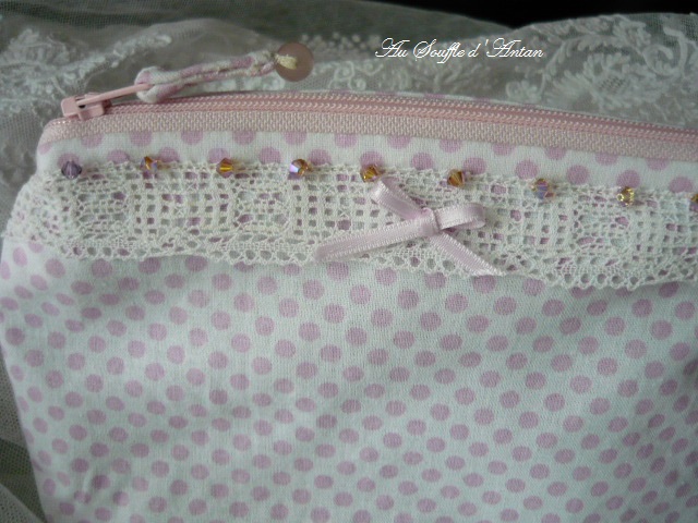 ♦* L'extérieur est en coton blanc imprimé de petits pois de couleur rose. Tissu contemporain. La trousse se ferme par une fermeture éclair rose. La partie haute est ornée d'une jolie dentelle ancienne + des perles et un petit noeud sur une face
