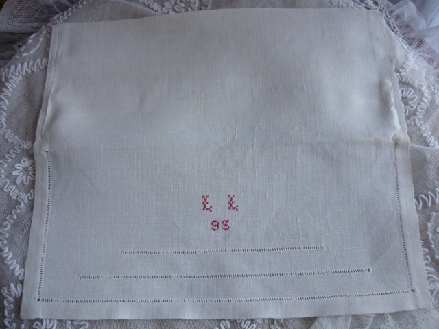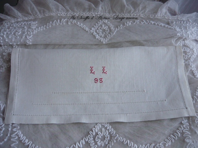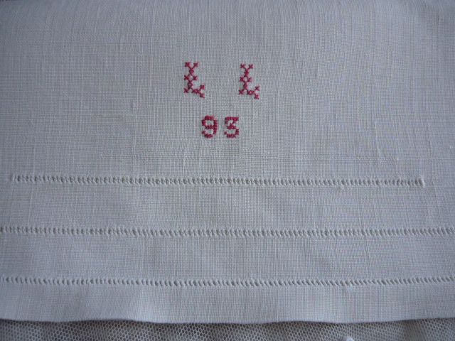 Le marquage L L et 9 3 a été brodé à la main au point de croix.