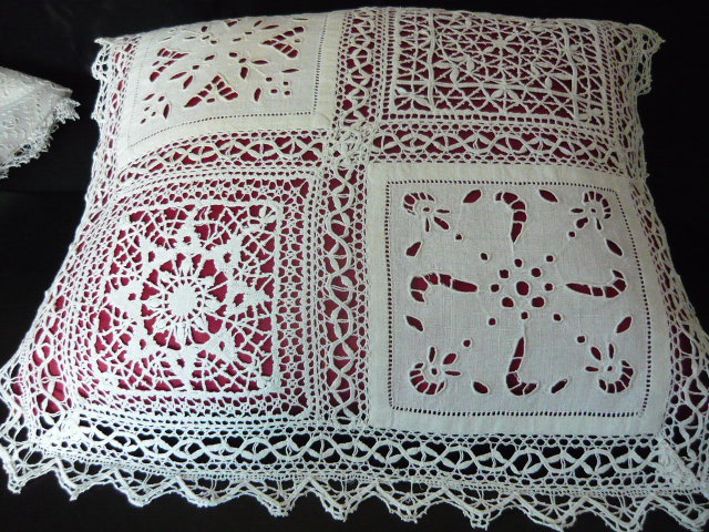 Magnifique dessus de coussin un bel assemble de broderie et de dentelle linge ancien très ouvragé riche en dentelle et broderie ancienne ligne ancien au charme du passé produit de qualité
