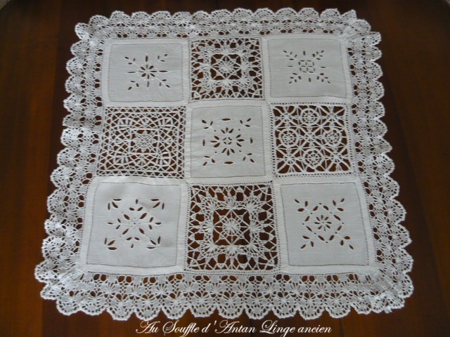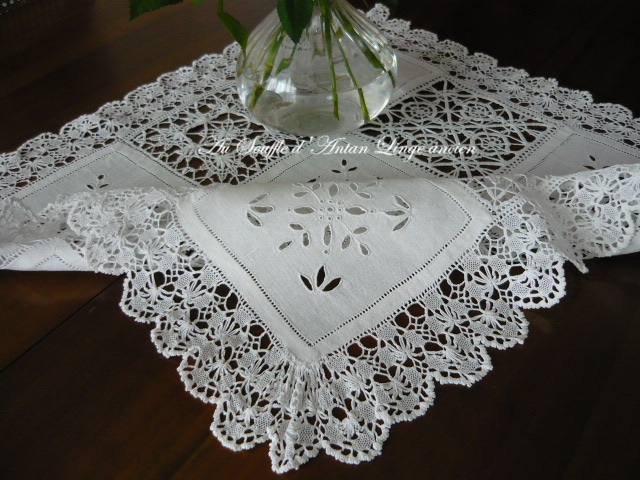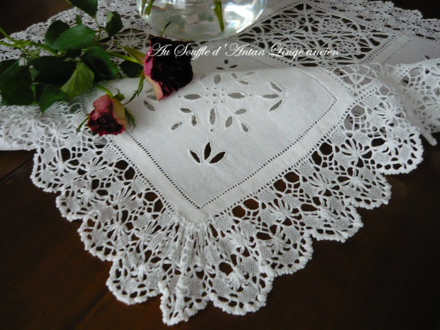 Centre de table broderie et dentelle ancienne Linge ancien blanc 58x56 cm