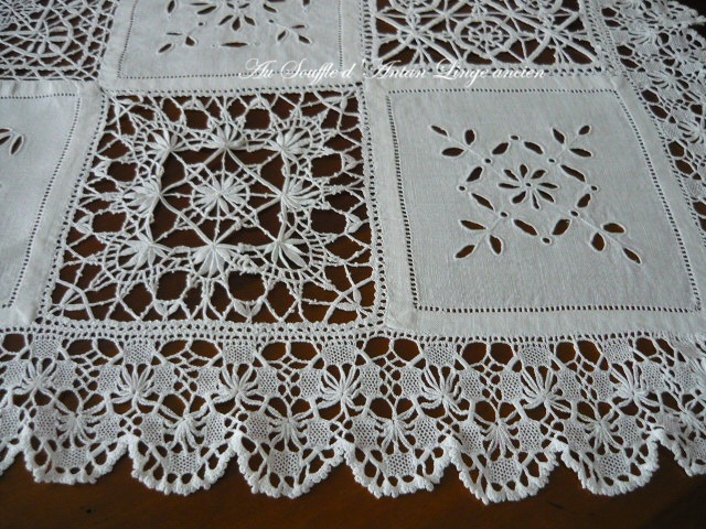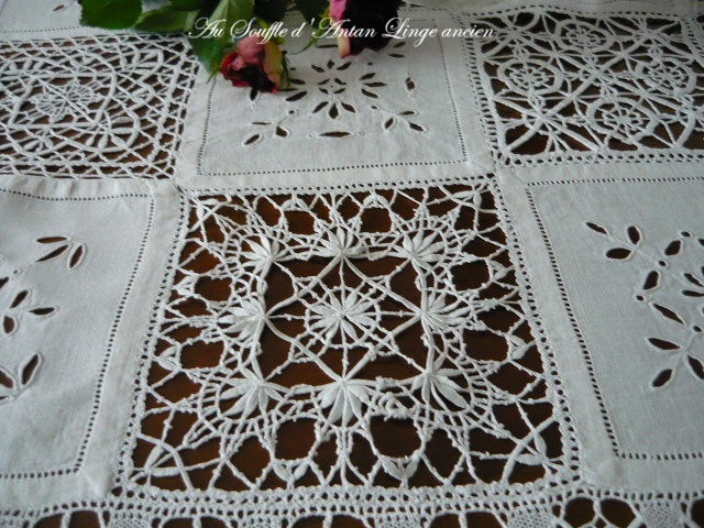 Ce ravissant centre de table présente des carrés de lin brodés de fleurs ajourées en borderie anglaise et d'autres en dentelle ancienne fait main.