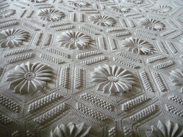 Superbe dessus de lit / couverture ancienne en coton couleur blanc présentant un bel assemblage de différents points de crochet et de tricot à l'aiguille jouant sur les volumes.