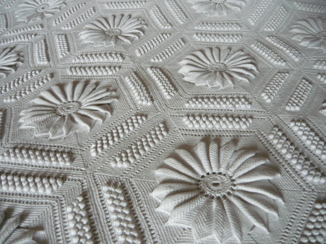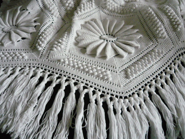 superbe dessus de lit // couverture ancienne La bordure se temine par un petit picot les deux autres côtés se terminent par de longues franges nouées linge ancien de qualité entièrement fait main