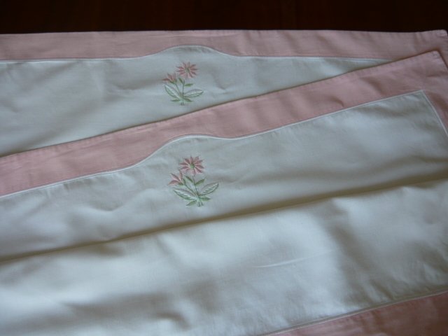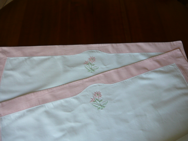 Au milieu, en partie haute de chaque taie est brodé à la machine aux fils de couleurs un rinceau de fleurs voir photo.