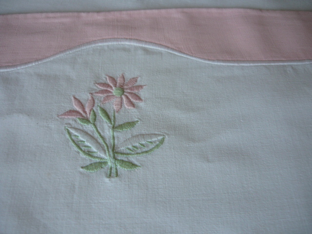 Voici une bonne paire de taies anciennes en métis lin et coton des années 1960 - couleur blanc- en pourtour un volant plat de couleur rose de 5 cm souligné par un point de bourdon blanc.