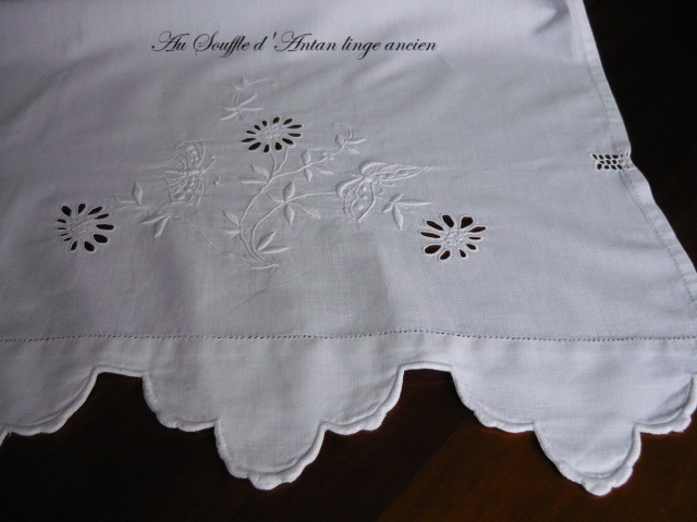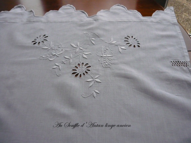 Un jolie travail de broderie : fleurs ajourées, papillons, en partie centrale 3 rangées de jours travaillés, la bordure est soulignée d'une fine rangée de jours au point de Paris et se termine par feston au point de rose.