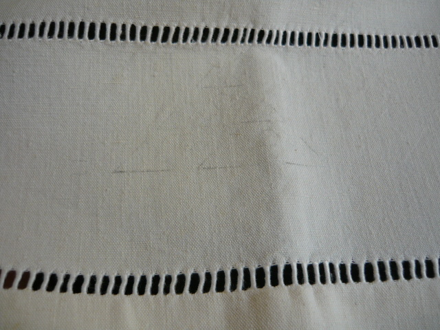 Ce drap ancien en métis, une toile de couleur naturelle écru présente en bordure trois rangées de jours Venise brodé à la main. Pas de broderie mais on peut deviner le traçage léger du crayon de préparation de la broderie qui n'a pas été effectuée.