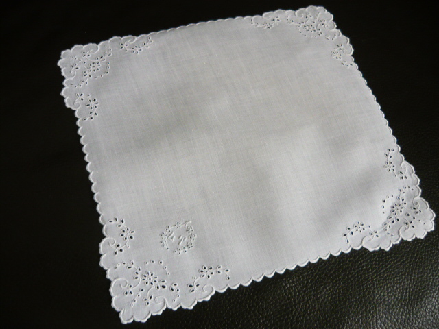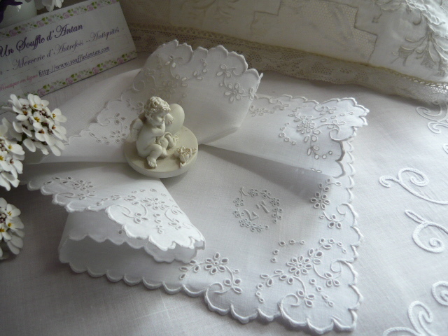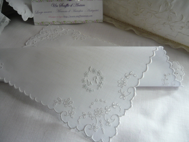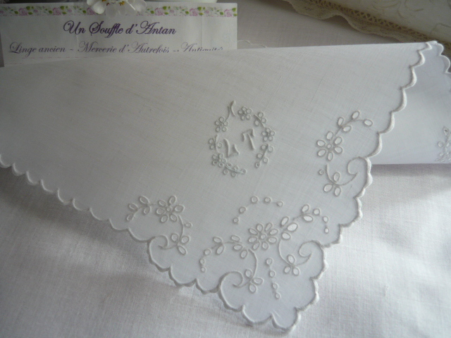 un mouchoir ravissant en batiste de lin et aux belles broderies blanches !