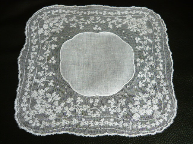 Un beau mouchoir ancien couleur écru en linon de lin satiné entouré d'une superbe dentelle ancienne sur tulle brodé de motifs floraux