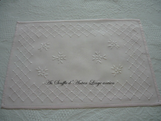 De forme rectangle, un superbe dessus de plateau / napperon ancien en coton couleur rose poudré, il est agrémenté de diverses broderies de couleur blanche, en bordure d'un ourlet ajouré.