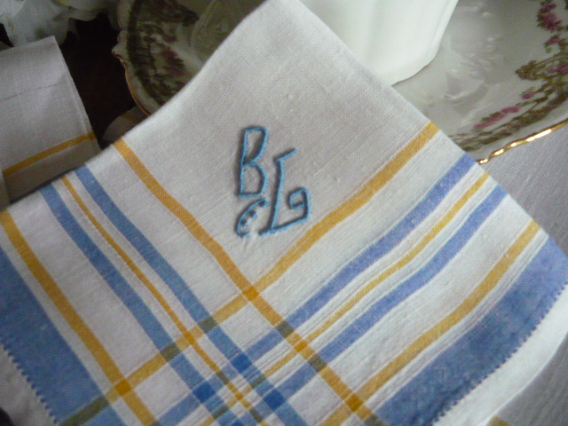 Dans un angle de chaque serviette un joli monogramme ancien BG est brodé à la main. Le graphisme des lettres peut être autrement interprété BL ? BC ?