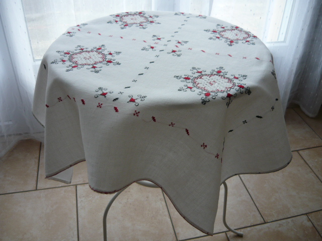 Charmante nappe ancienne à thé lin linge ancien brodé main rouge et noir