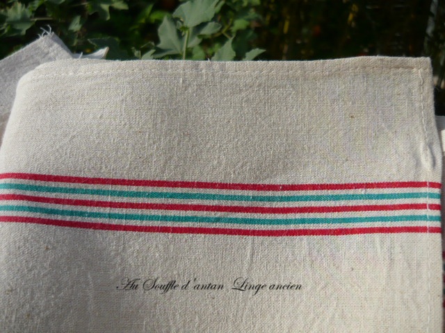 Une toile couleur "écru" souple agrémentée de rayures de couleur rouge, vert sur 2 côtés. Les ourlets sont cousus à la machine, lien d'attache. Les photos font partie du descriptif