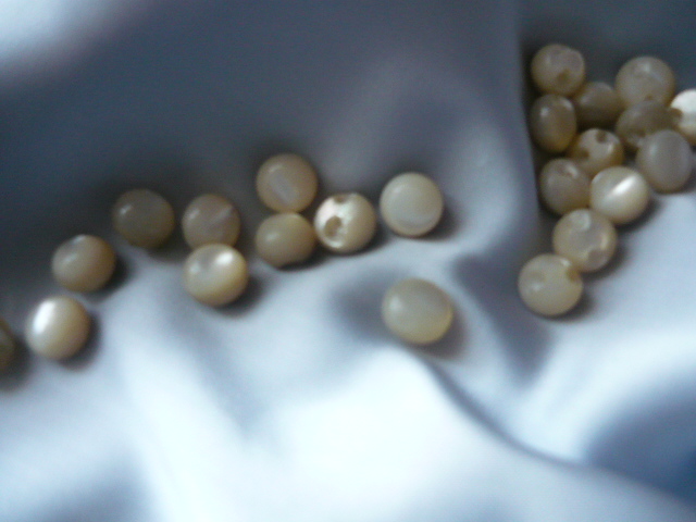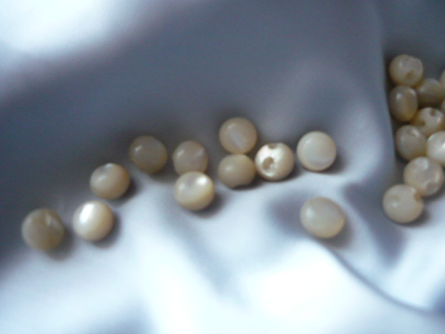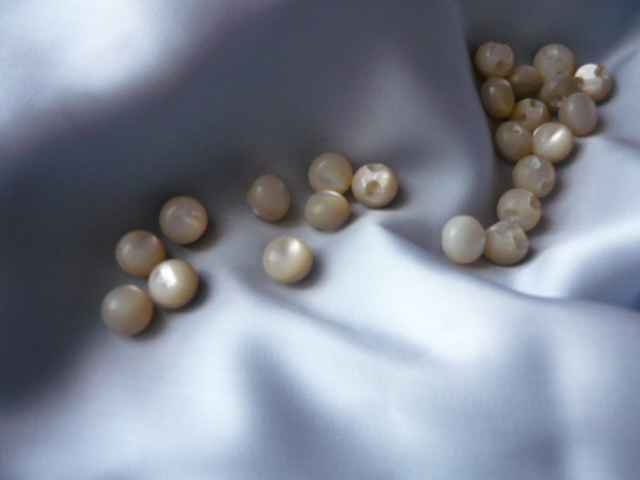 Des petites merveilles 22 boutons anciens en nacre, une forme de petite boule aplatie avec 2 trous - On dirait des perles !