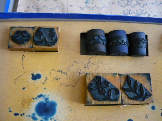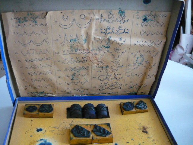 Trésor de brodeuse : une belle boite ancienne et ses accessoires anciens de plus de 100 ans tampons et rouleaux de marquage pour réaliser de la broderie ou autres ouvrages.