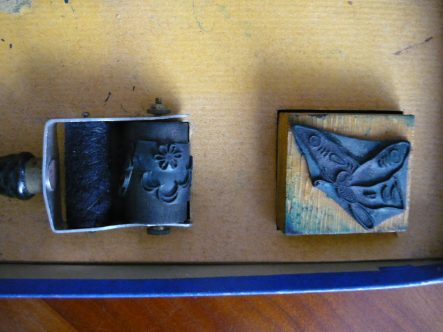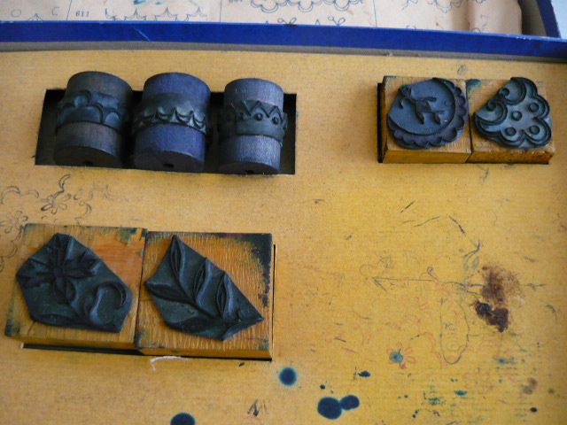 Elle contient de 3 anciens tampons rouleaux bois et caoutchouc pour festonneur de divers motifs bordures de frises + 1 festonneur avec un tampon rouleau + 6 carrés tampons anciens bois et caoutchouc de divers motifs arabesques, fleurs dont roses, papillon