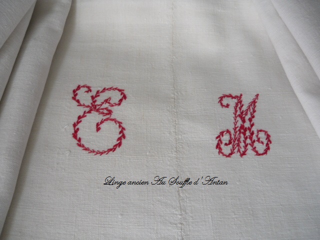 A une extrémité un monogramme ancien E M broderie ancienne de couleur rouge qui se compose de lettres brodées à la main aux points d'épine
