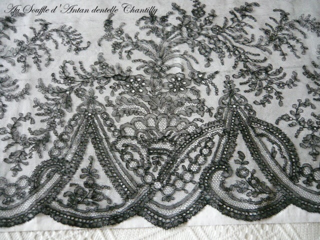 Volant dentelle ancienne noire XIXe large et belle Chantilly 3m45 x 0.43 cm