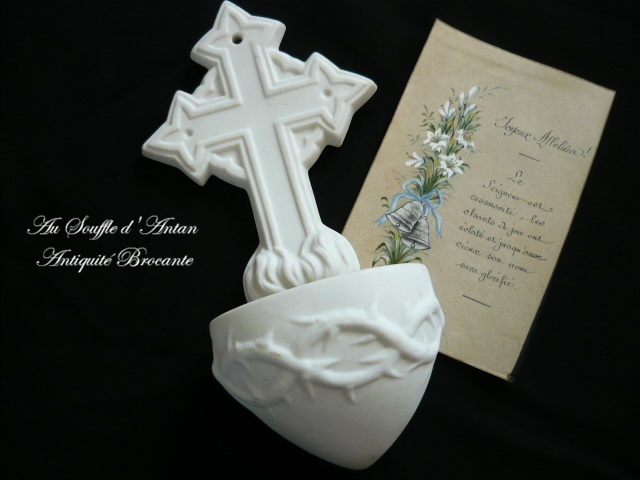 Benitier ancien blanc et image pieuse brocante en ligne porcelaine & celluloïd