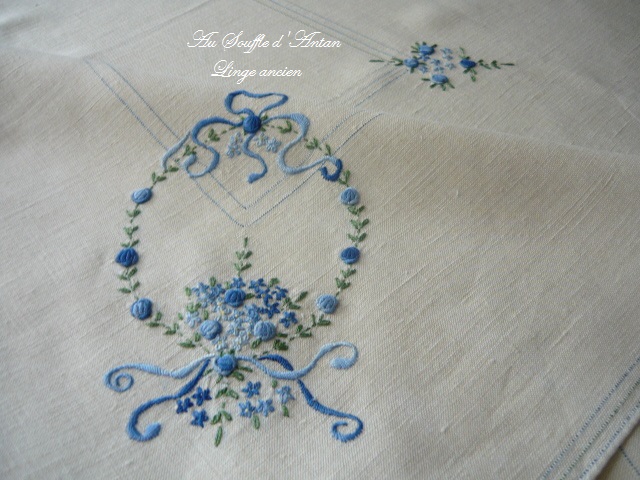 Linge ancien brodé, fleurs du jardin, antiquités, brocante AU SOUFFLE D'ANTAN