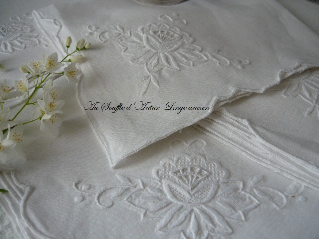 *Intemporel linge ancien en lin blanc* 2 Pièces nappe/serviette 100 x 74 cm