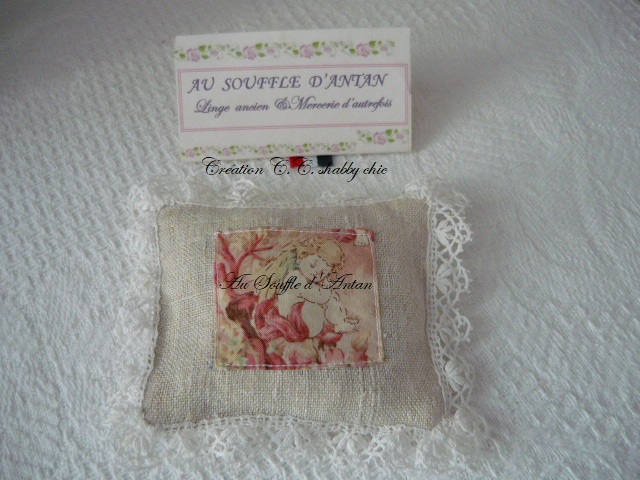 à partir de linge ancien création C.C. shabby chic linge et mercerie d'autrefois verso du petit coussin à lavande réalisé à partir de linge ancien