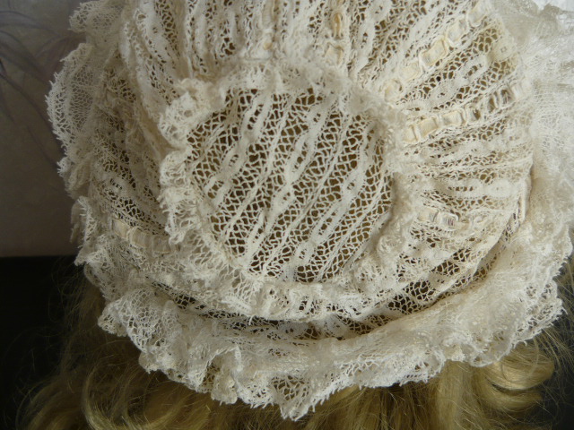 ♦ Un petit bonnet ancien de bébé couleur ivoire confectionné à la main, il a été réalisé dans de fines dentelles et de petits rubans de soie glissés tous les 2 rangées.