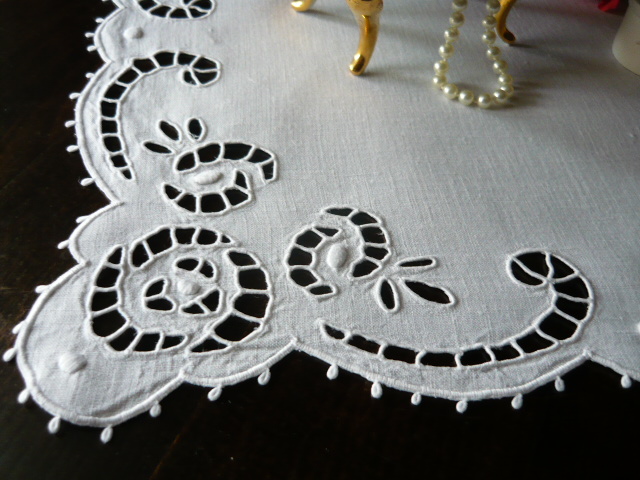 Superbe petit centre de table / napperon ancien en lin forme carré, couleur blanc,orné en pourtour de jolies fleurs ajourées en broderie Richelieu et de points de plumetis.