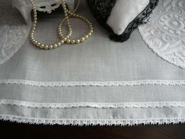 pour la décoration linge ancien en orgendi une application brodée de chaque côté en bordure 3 rangées de fine dentelle ancienne centre de table ancien raffiné
