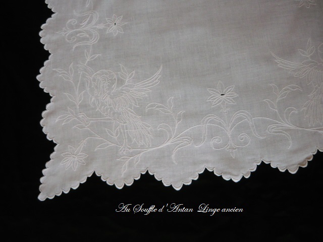 Un centre de table / petite nappe de couleur blanc agrémenté en pourtour d'une jolie broderie de fleurs et d'oiseaux, la bordure est festonnée.