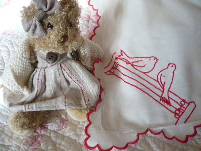 Cette petite taie des années 1950 est bordée d'un point de feston rouge et dans les deux angles du bas broderie au point de tige de deux oiseaux..
