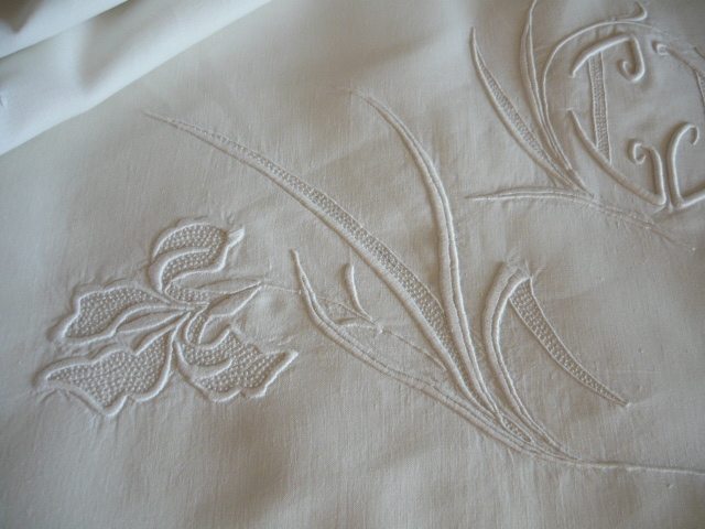 Linge ancien pour le lit beau drap ancien aux surperbes broderies d'iris