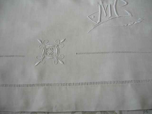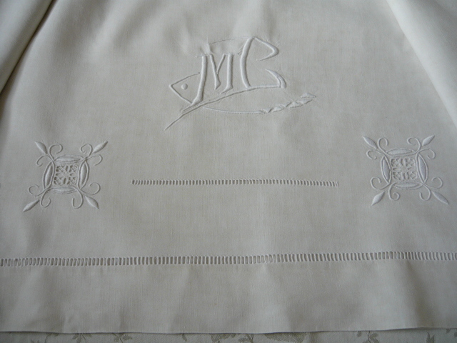 La bordure du drap présente en bordure une rivière de jours Venise, au dessus en alternance rangées de jours Venise et de magnifiques motifs à fleurs de lys au nombre de 6 , au centre de la découverte un joli monogramme MC bien en volume .