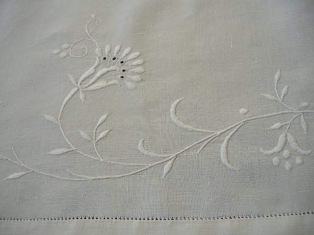 Tout le long de la bordure du drap est brodée une belle guirlande de fleurs. Pas de monogramme, pas de retour