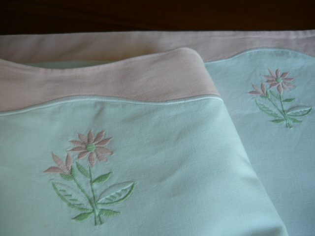 Voici une bonne paire de taies anciennes en métis lin et coton des années 1960 - couleur blanc- en pourtour un volant plat de couleur rose de 5 cm souligné par un point de bourdon blanc.