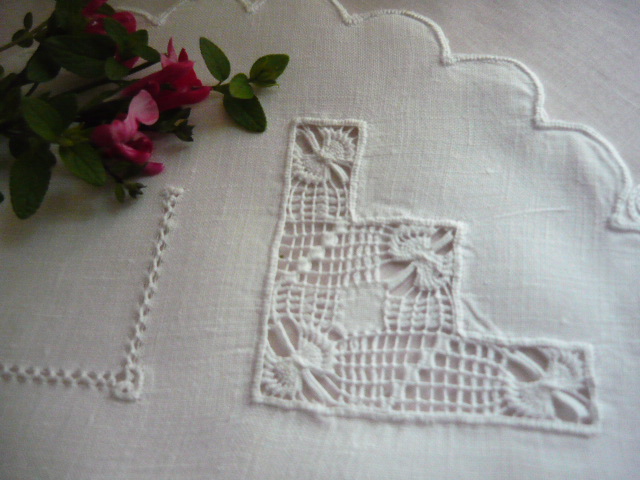 linge ancien & fleur du jardin // avec son charme du passé le linge ancien est toujours de mode, apprécié de tout temps, idée cadeau Le côté original de ce linge ancien est le décalage de la broderie blance // un côté très pratique lin et broderie ce linge ancien est bien blanc // il est en excellent état