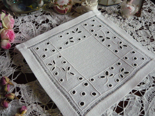 Un charmant napperon ancien en lin granité de couleur blanc en broderie anglaise.
