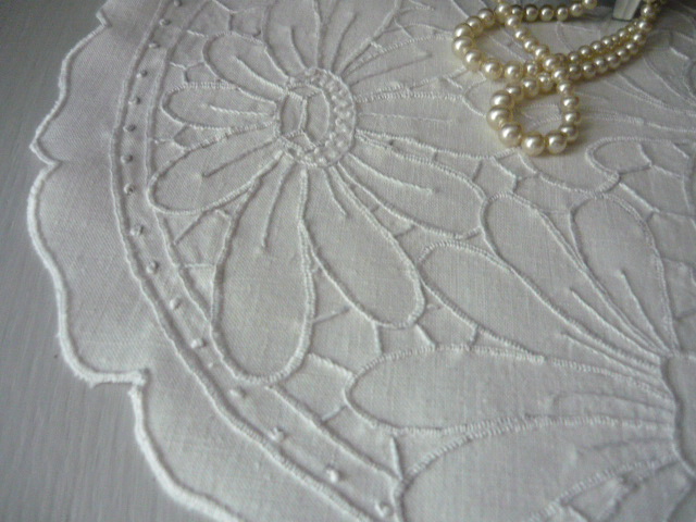Un bel ouvrage ! Joli napperon de forme ronde à broderie de fleurs en broderie blanche, le pourtour est au point de feston.