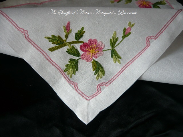 Gracieuse broderie aux fils de couleur voici un charmant napperon brodé à la main au point de Beauvais .