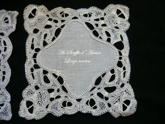 L'un et l'autre sont sensiblement pareilles voici 2 charmants petits napperons anciens de forme carré ornés de broderie, de dentelles au lacet, de barrettes à petits picots travaillées à l'aiguille. La partie centrale est en lin.