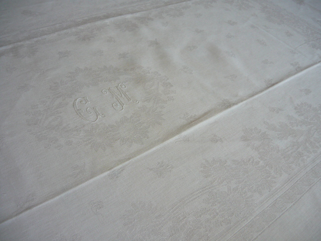 jolie nappe ancienne blanche en damassé linge ancien brodé de jolies lettres blanche linge ancien de belle qualité à motifs de fleurs tissées linge ancien pour la table un joli damassé à décor floral le linge ancien avec son charme d'antan s'invite à votre table