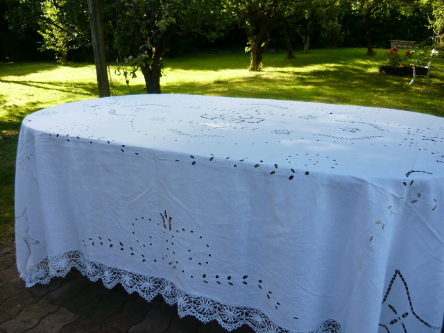 ♦ La nappe présente un bel ensemble de guirlande de fleurs en broderie anglaise, de jours fantaisie et d'insertions de dentelle à aux fuseaux.