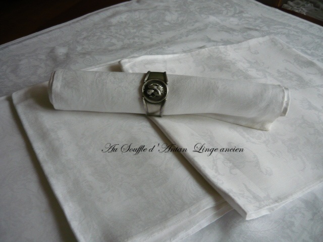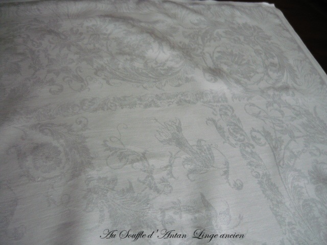 Du linge de table en très bon état , il est devenu rare de nos jours de trouver cette matière et ce décor. C'est vraiment du beau linge de famille.